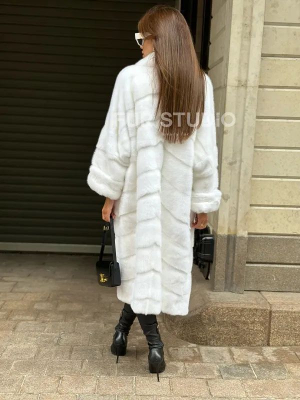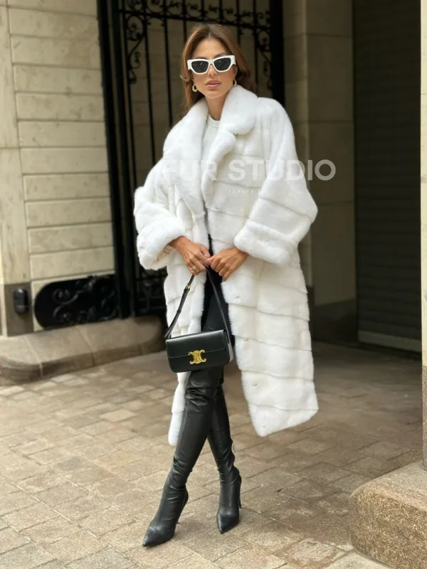 Мех данной шубы аукционная норка , цвет белый. Предлагается в размерах от 42 до 50 (инд пошив от 52 до 62 ). Длина модели 105-110 см, что выгодно подчеркивает фигуру девушек. Эта модель идеально подойдет для девушек и женщин, предпочитающих роскошные натуральные меха.