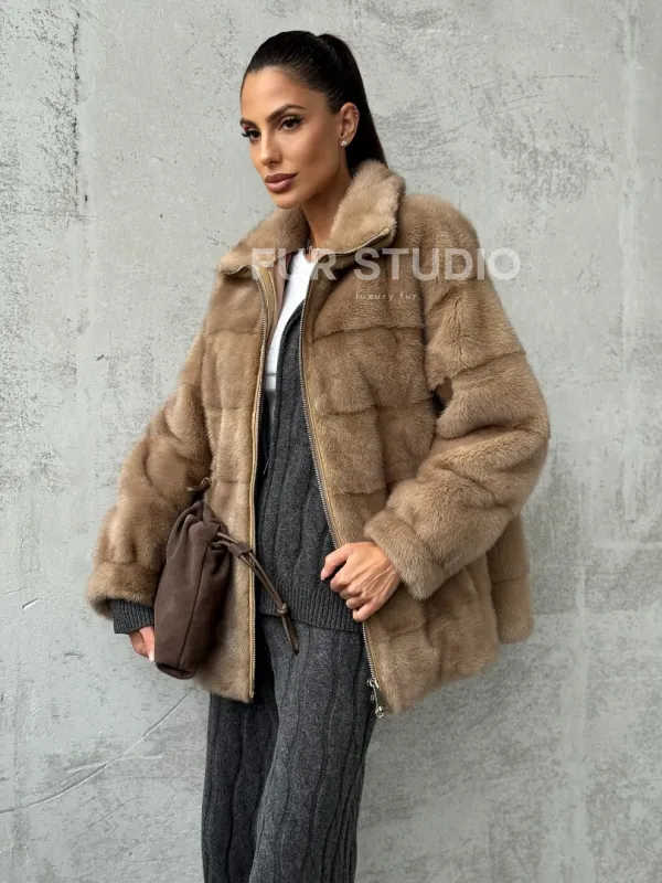 Мех данной шубы аукционная норка, цвет бежевый. Предлагается в размерах от 42 до 50. Длина модели 65-70 см, что выгодно подчеркивает фигуру девушек. Эта модель идеально подойдет для девушек и женщин, предпочитающих роскошные натуральные меха.