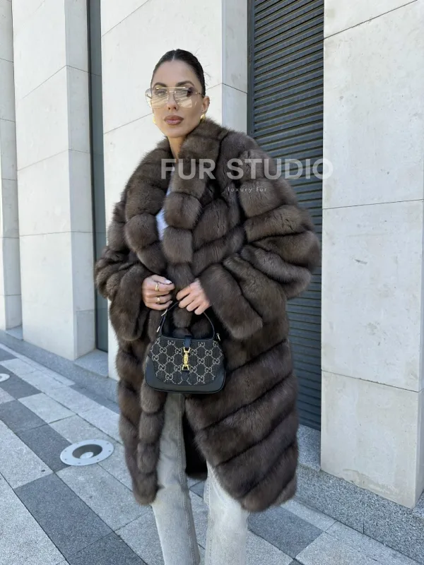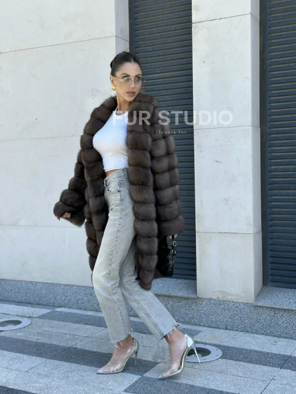 Легкая и стильная шуба из темного меха баргузинского соболя в длине миди — выбор деловых и активных женщин. Эта модель отлично подходит тем, кто ездит за рулем, но также и для любительниц прогуливаться пешком в любую погоду.