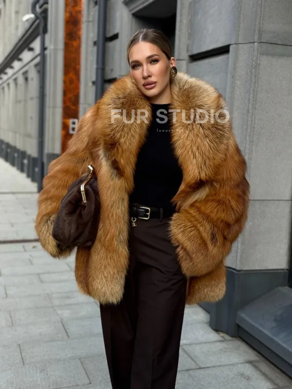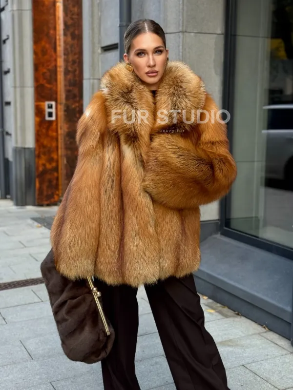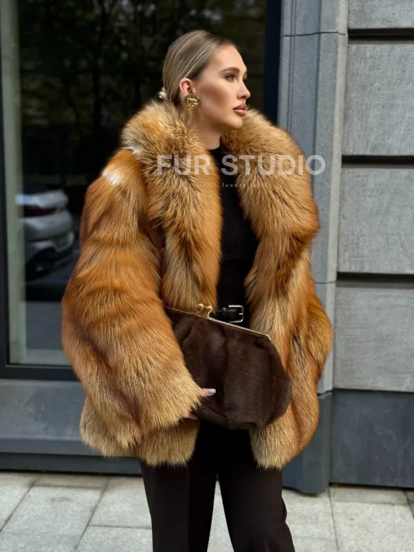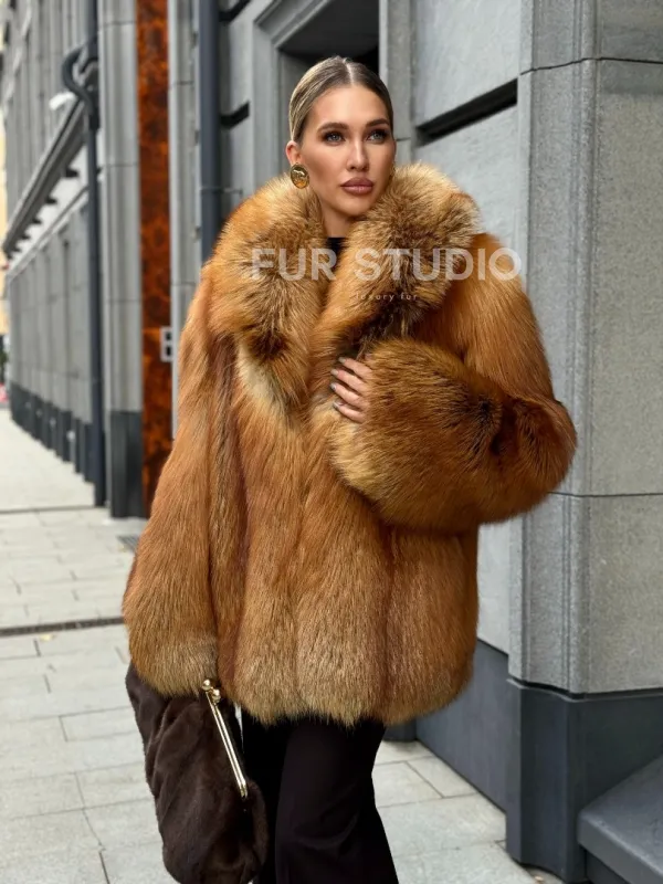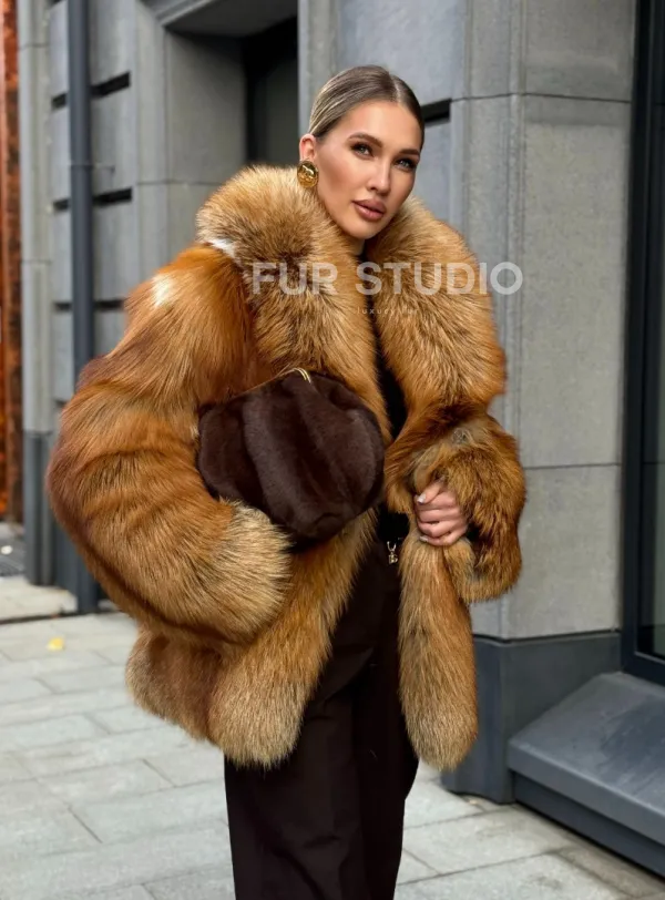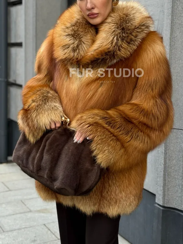 Шуба из лисы огневки отличается следующими особенностями: Объёмный фасон — придаёт образу элегантность и статусность. Широкий воротник — подчёркивает шею и добавляет выразительности. Пышные рукава — создают эффектный силуэт. Натуральная текстура меха — выглядит густой и шелковистой, что говорит о высоком качестве изделия. Тёплый рыжевато-золотистый оттенок — делает шубу заметной и стильной. Образ дополнен: лаконичными тёмными брюками, которые контрастируют с шубой; крупными золотыми серьгами, подчёркивающими утончённость; меховой сумкой в тёмных тонах, гармонирующей с общим стилем. Такой наряд идеально подойдёт для холодного времени года и торжественных случаев.
