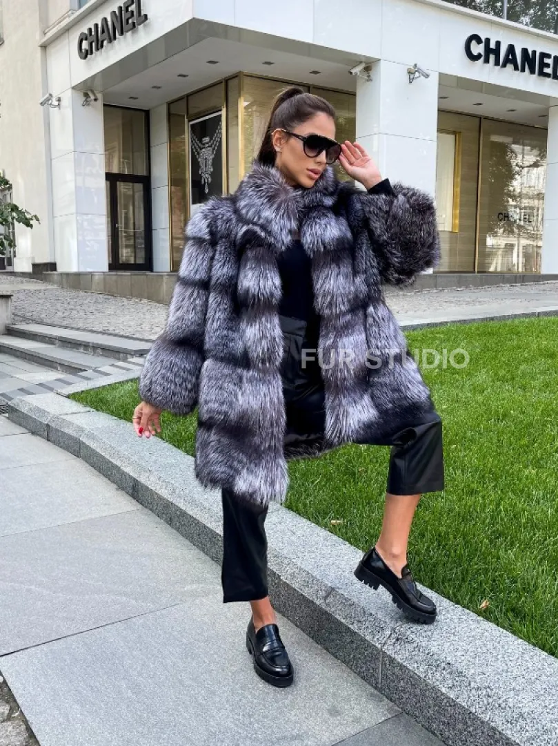 Шуба из меха чернобурой лисы - отличный выбор женщин, которые любят выглядеть стильно в любое время года. Мех смотрится роскошно и дорого. Необычная расцветка подчеркнет цвет волос и глаз владелицы. В шубе будет комфортно даже в холодную зиму. Прямой крой зрительно увеличит рост. Широкие манжеты делают акцент на тонкости кистей.