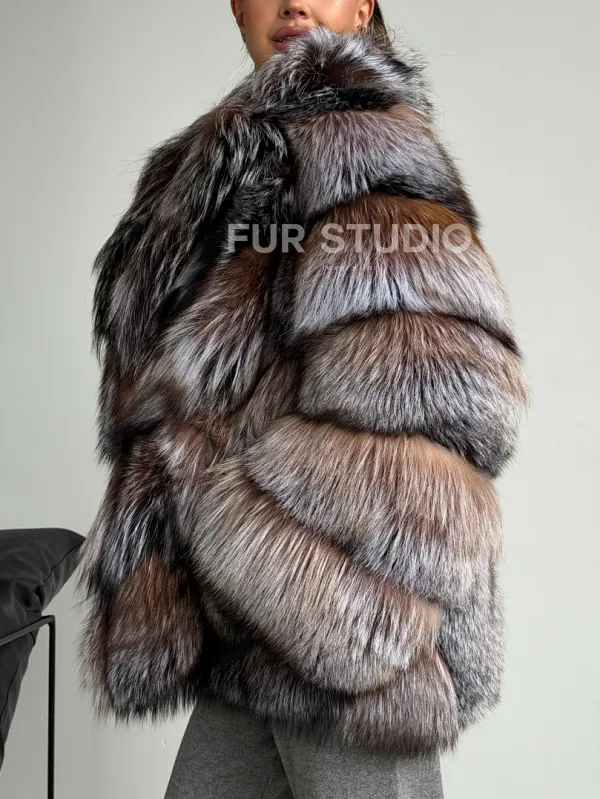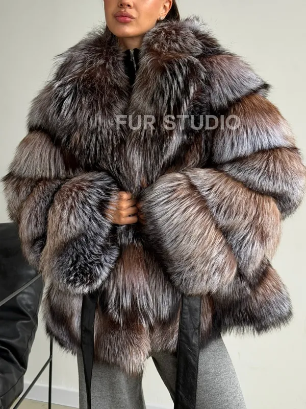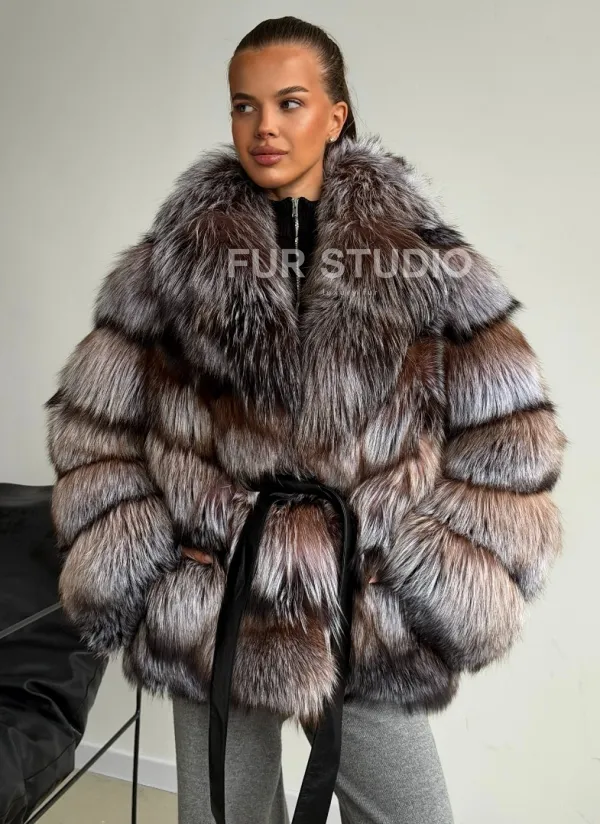 Мех данной шубы лиса, цвет серый. Предлагается в размерах от 42 до 50. Длина модели 65-70 см, что выгодно подчеркивает фигуру девушек. Эта модель идеально подойдет для девушек и женщин, предпочитающих роскошные натуральные меха.