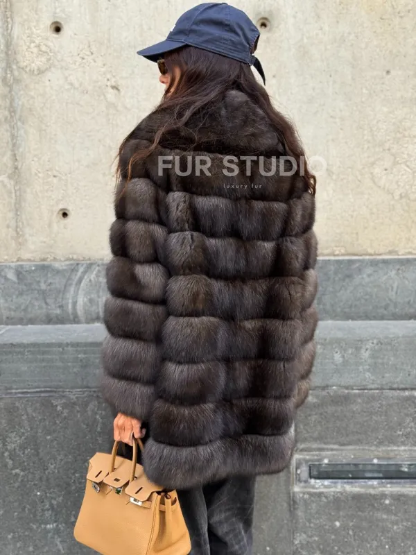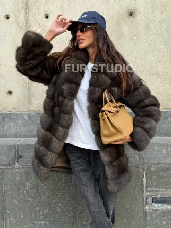 Оптимальная длина удобна в носке, не сковывает движение. Воротник стойка позаботится о шее в непогоду и подчеркнет ее изящество. Широкие рукава выделят тонкие кисти. Прямой крой удлиняет силуэт и зрительно скрывает недостатки фигуры. Купить шубу из меха соболя станет отличным вложением для женщин, которые не привыкли себе в чем-то отказывать.