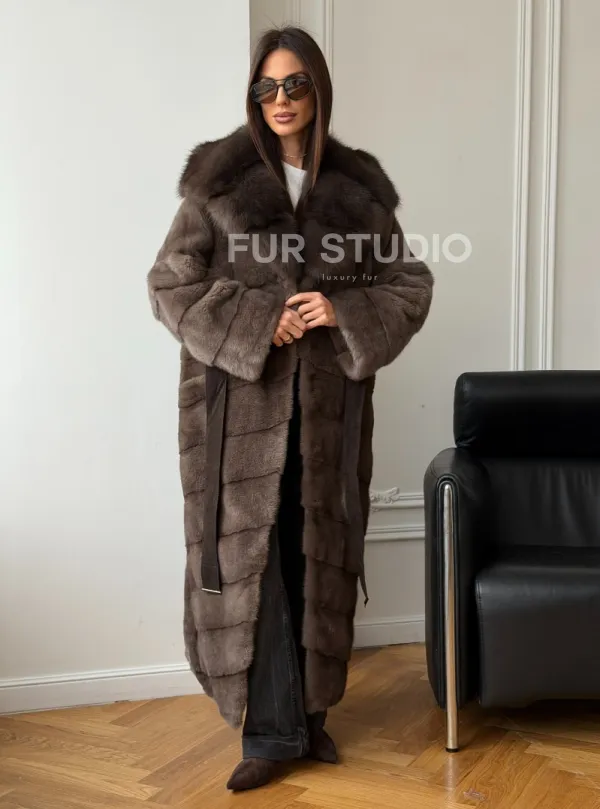 Мех данной шубы аукционная норка, цвет коричневый. Предлагается в размерах от 42 до 48. Длина модели 130-135 см, что выгодно подчеркивает фигуру девушек. Эта модель идеально подойдет для девушек и женщин, предпочитающих роскошные натуральные меха.