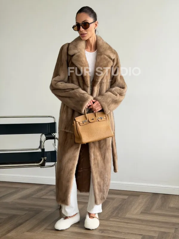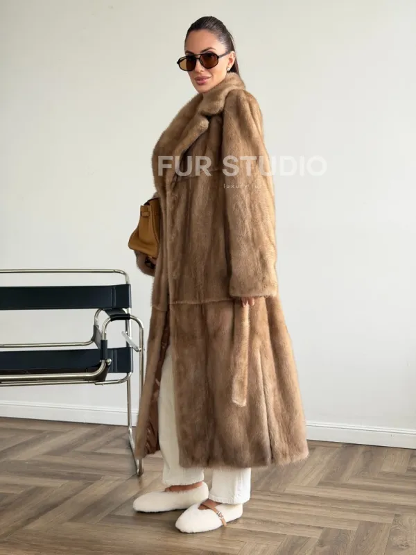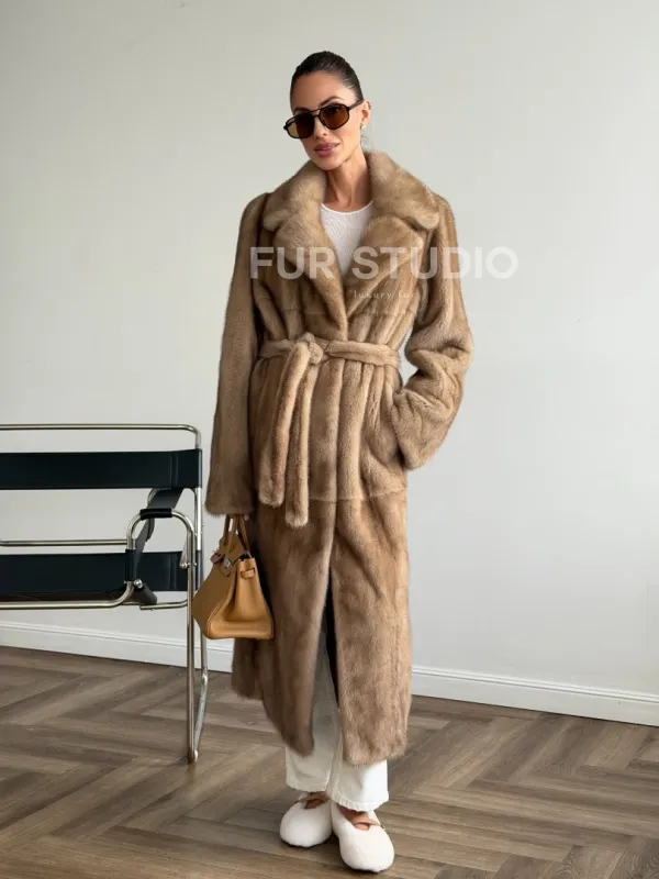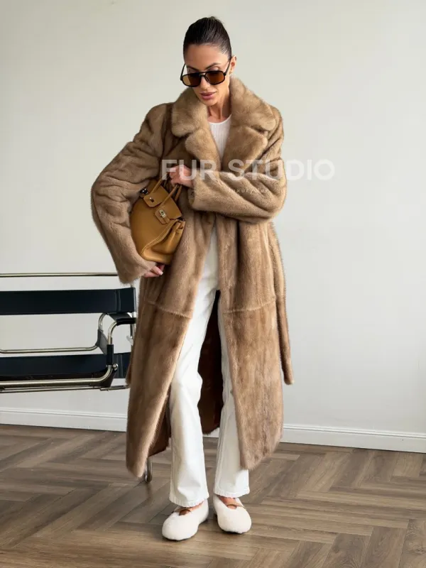 Мех данной шубы аукционная норка , цвет бежевый. Предлагается в размерах от 42 до 50. Длина модели 115-120 см, что выгодно подчеркивает фигуру девушек. Эта модель идеально подойдет для девушек и женщин, предпочитающих роскошные натуральные меха.