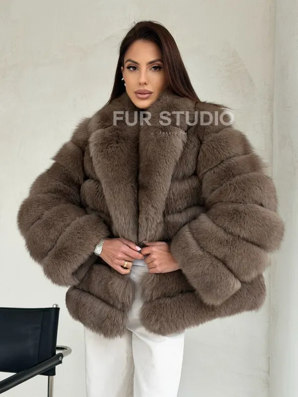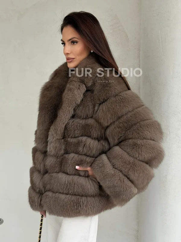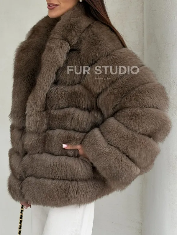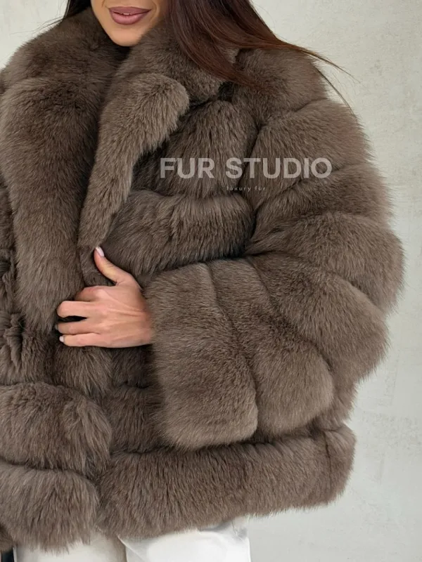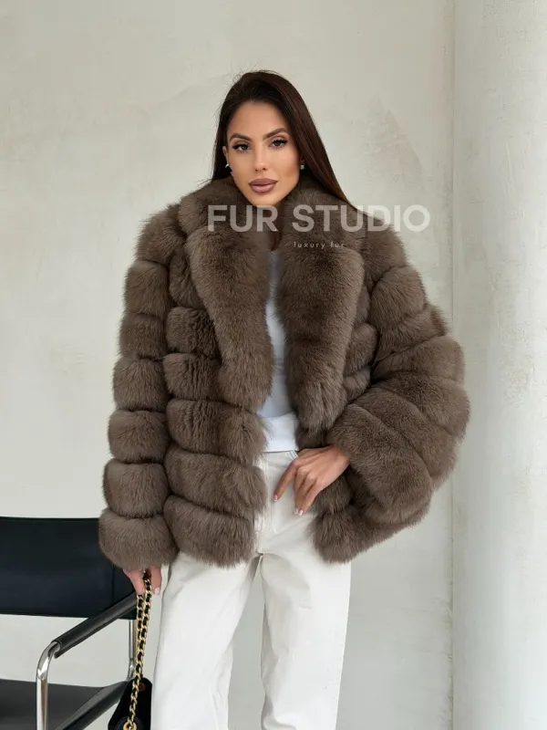 Мех данной шубы финский песец, цвет коричневый. Предлагается в размерах от 42 до 48. Длина модели 60-65 см, что выгодно подчеркивает фигуру девушек. Эта модель идеально подойдет для девушек и женщин, предпочитающих роскошные натуральные меха.