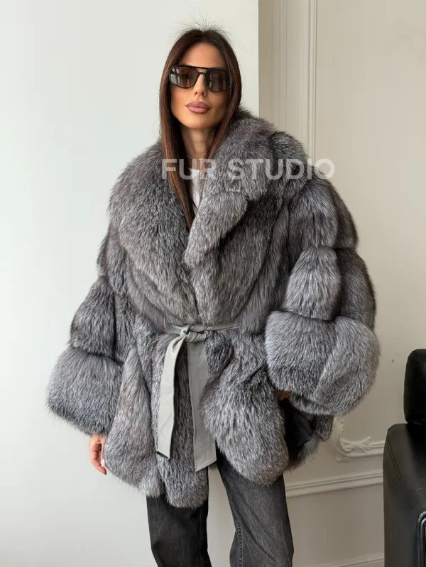 Мех данной шубы лиса, цвет серый. Предлагается в размерах от 42 до 52 (oversize). Длина модели 75-80 см, что выгодно подчеркивает фигуру девушек. Эта модель идеально подойдет для девушек и женщин, предпочитающих роскошные натуральные меха.