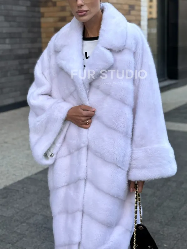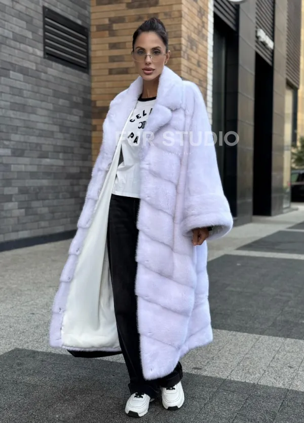 Мех данной шубы аукционная норка , цвет белый. Предлагается в размерах от 42 до 68. Длина модели 115-120 см, что выгодно подчеркивает фигуру девушек. Эта модель идеально подойдет для девушек и женщин, предпочитающих роскошные натуральные меха.
